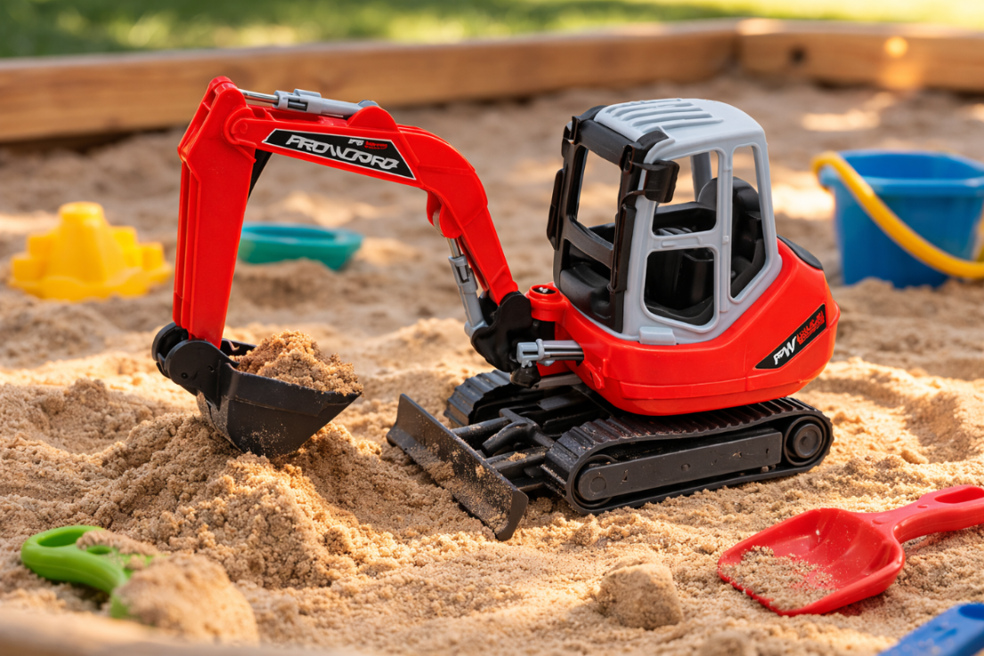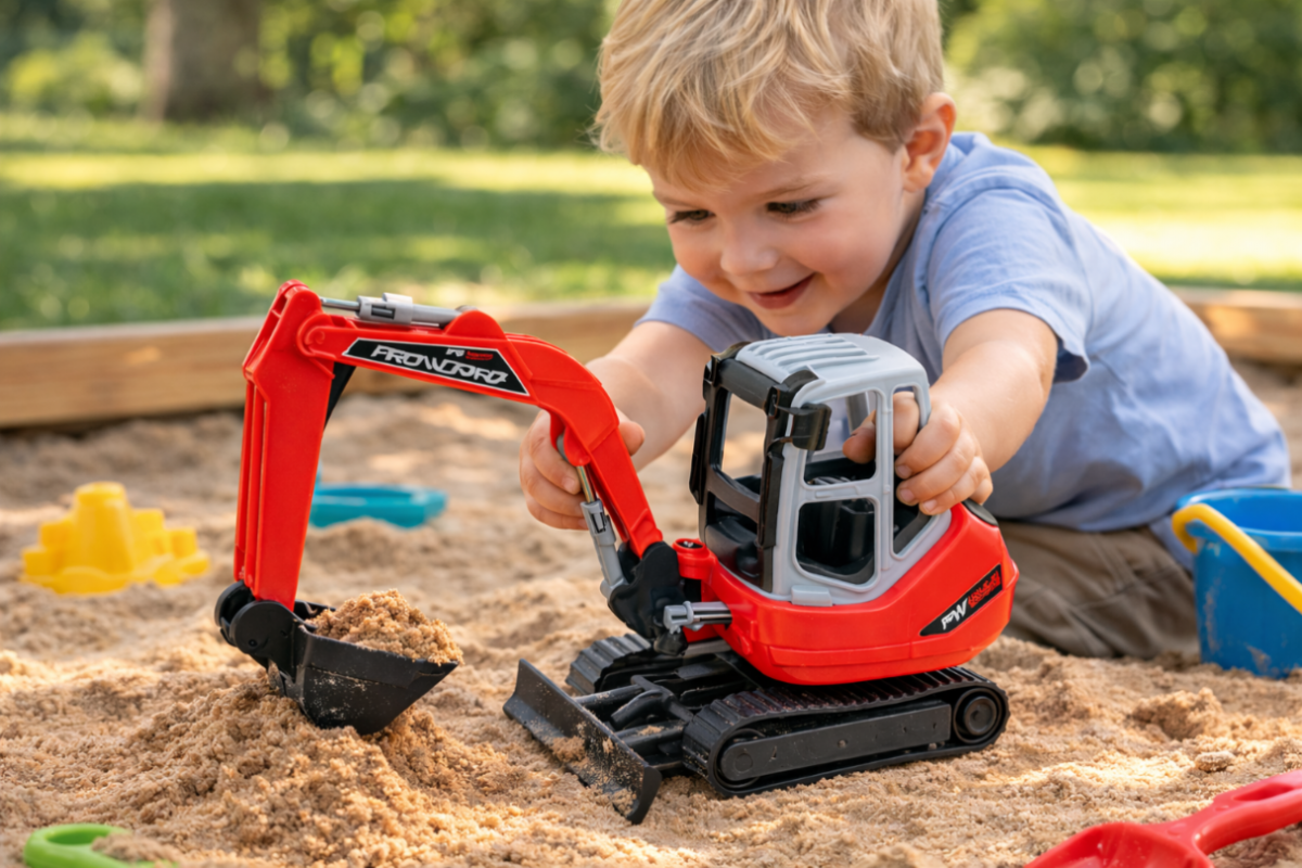 Model jest lekki i poręczny, dzięki czemu dzieci łatwo mogą przenosić go w wybrane miejsce zabawy. Kompaktowe wymiary sprawiają, że koparka zmieści się do torby plażowej lub schowka w ogrodzie.