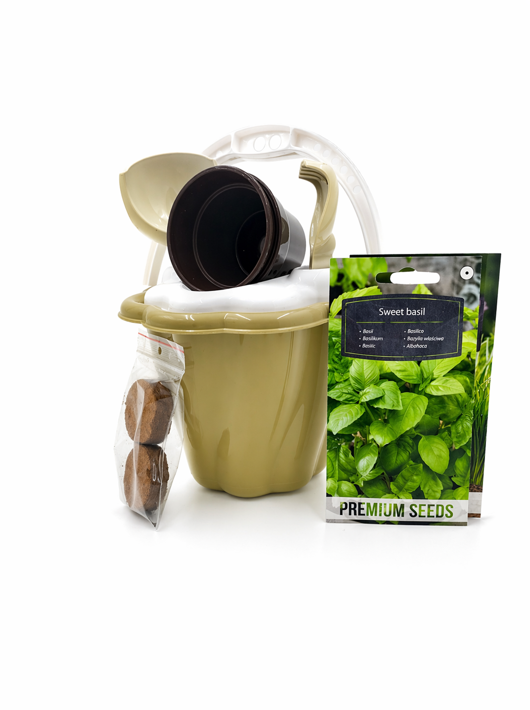 • 2 rodzaje nasion: bazylia oraz trawa dla kota