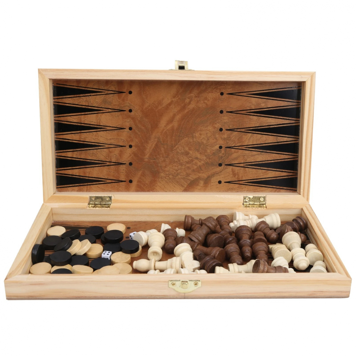 Ponadczasowy zestaw 3w1 - ta klasyczna towarzyska gra nigdy się nie znudzi. Pięknie i solidnie wykonana szachownica zachwyci każdego gracza. Poręczna kaseta zamykana jest na zatrzask, po zamknięciu zajmuje niewiele miejsca i łatwo się ją przechowuje. Drewniane szachy to takżeświetna propozycja prezentu dla miłośników gier planszowych i fanów szachów. Tak elegancki prezent, docenią zarówno amatorzy, jak i profesjonaliści.
