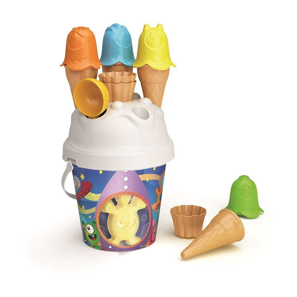 Kilkuletnie dzieci czerpią mnóstwo przyjemności z zabawy w piasku. Nieważne, czy jest to mała piaskownica w przydomowym ogródku, czy też szeroka plaża nad jeziorem lub nad morzem. Wystarczy dać maluchowi zestaw do piasku z bogatym wyposażeniem, aby dostarczy ć mu ciekawą rozrywkę na długi czas! Kosmiczny zestaw z lodami to gwarancja udanej zabawy dla każdego kilkulatka. W komplecie znajduje się wiaderko z atrakcyjnymi dla dziecka morskimi motywami, foremki do robienia babeczek i gałek lodowych oraz foremki w kształcie kosmicznych stworków. Dzięki licznym elementom, każdy maluch znajdzie mnóstwo pomysłów na udaną zabawę w piasku.