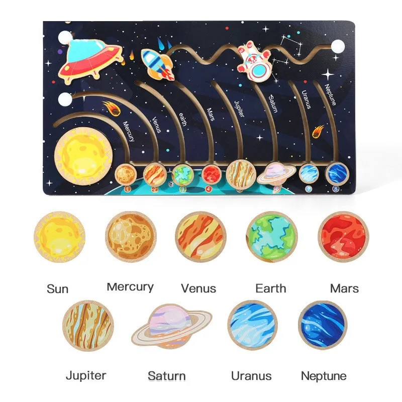 Drewniany Układ Słoneczny to zabawka, który nie tylko bawi ale także uczy. Jak wiadomo nasz system planetarny nazywany jest Układem Słonecznym, na cześć jesgo centralnej gwiazdy czyli Słońca. Nasz Układ Słoneczny to zbiór 8 planet oraz ich księżyców, które krążą na orbicie wokół Słońca. Skomplikowane? Nic bardziej mylnego ;) Drewniany Układ Słoneczny przybliży dziecku nazwy, wielkość oraz cechy charakterystyczne planet, jak i samo umiejscowienie Słońca w okół którego krążą. Dzięki systemowi labiryntów dziecko ma możliwość przesuwania planet oraz umiejscowianiu ich na odpowiedniej orbicie. Dzięki temu dziekcko przyswaja nazwy i kolejność krążących wokół Słońca planet. Dodatkową atrakcją jest rakieta oraz kosmonauta, który również podąża określonym torem. Układanka jest fantastyczną formą zachęty do rozpoczęcia przygody z astronomią. To niezwykle ekscytująca dziedzina nauki!