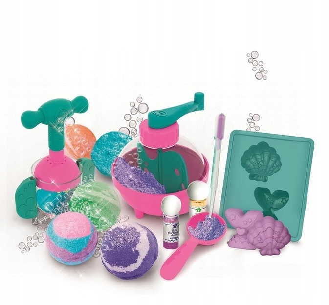 Przy pomocy zestawu można mieszać substancje i modelować je, aby po ich wysuszeniu otrzymywać spersonalizowane i wyjątkowe kule do kąpieli.