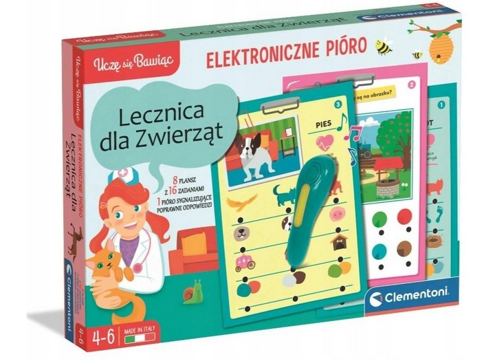 Interaktywny zestaw edukacyjny Clementoni to doskonała propozycja dla dzieci ciekawych świata zwierząt i pracy weterynarza. Zestaw składa się z mówiącego pióra oraz plansz edukacyjnych, które wprowadzają najmłodszych w świat quizów i zagadek.