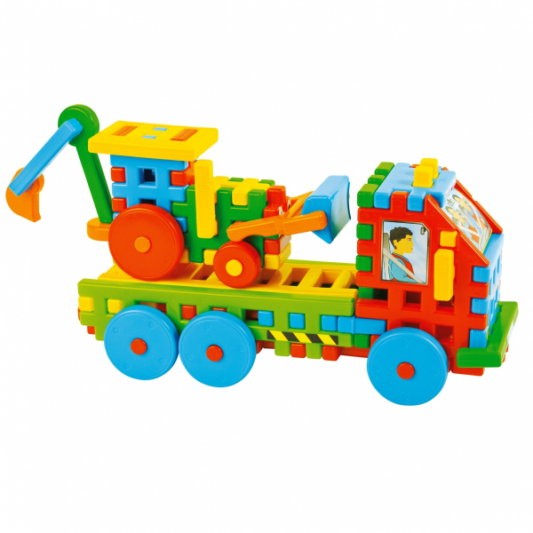 Model ciężarówki wykonanej z klocków konstrukcyjnych. W zestawie samochód plus koparka. Zestaw kompatybilny z innymi zestawami klocków konstrukcyjnych.
