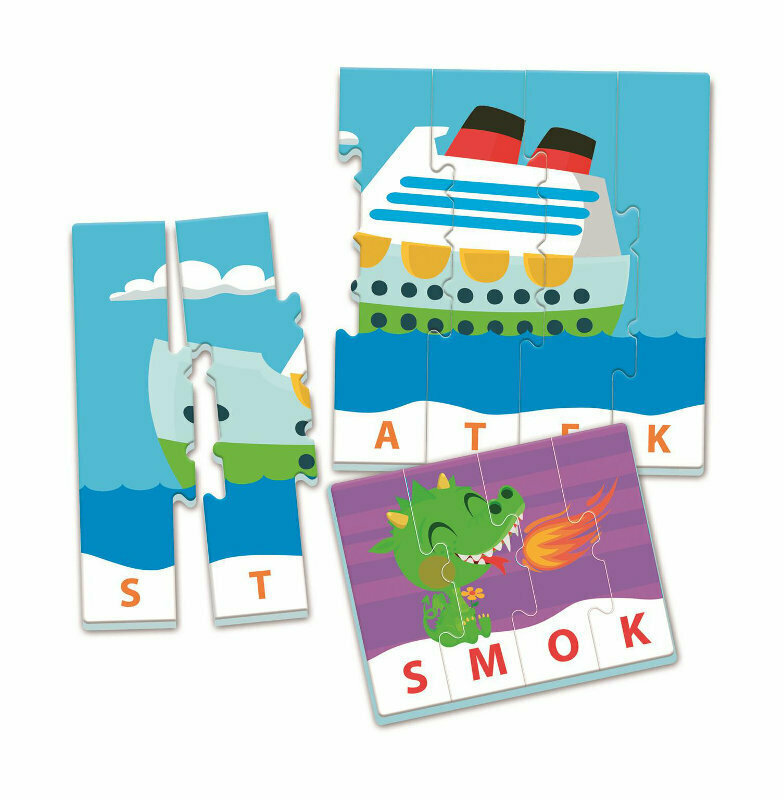 • Kolorowe ilustracje i zabawne postacie stymulują dziecko do układania obrazków i odkrywania wraz z każdym elementem liter składających się na dane słowo.