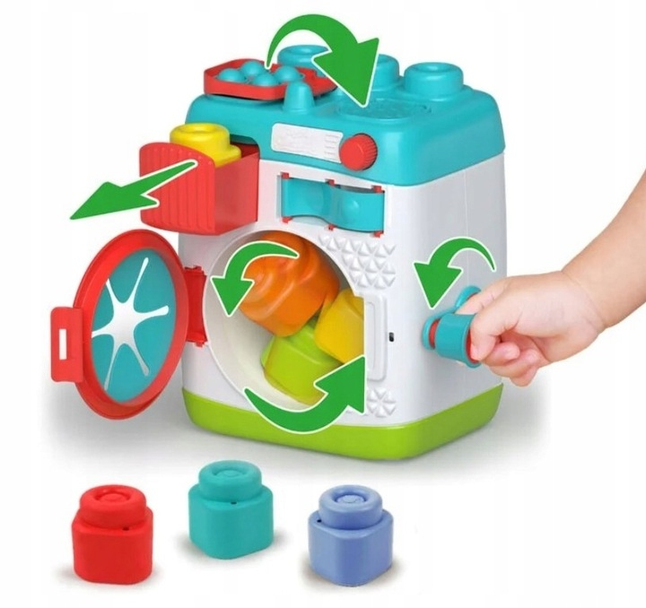 Zabawa na okrągło z pralką Clemmy to coś więcej niż tylko odgrywanie ról – to także stymulacja zmysłów i rozwój małej motoryki. Dziecko może wkładać miękkie klocki do środka, kręcić bocznym pokrętłem i obserwować, jak „wiruje” zawartość bębna, co przypomina prawdziwe pranie! Każdy element pralki został zaprojektowany z myślą o najmłodszych – duże przyciski, bezpieczne kształty i sensoryczne powierzchnie przyciągają uwagę i zachęcają do odkrywania.