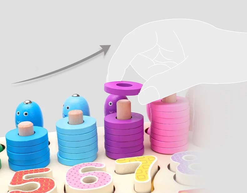Układanka została wykonana z drewna, w pięknej żywej kolorystyce. Zabawka może pełnić funkcję liczydła wielofunkcyjnego. Plansza zawiera rybki magnetyczne oraz wędkę za pomocą, której dziecko łowi rybki ćwicząc jednocześnie koordynację. Dodatkowo plansza została wyposażona w figury geometryczne, które należy wpasować w odpowiedni otwór. Kolejną atrakcją są cyfry z pomocą których można wykonywać proste działania matematyczne oraz które należy ułożyć również w odpowiedniej kolejności na planszy w specjalnych otworach. Jest to doskonały sposób na wprowadzenie matematyki w formie zabawy! Na podstawce zostało umieszczonych również 10 pionowych patyczków, gdzie należy nałożyć odpowiednią ilości obręczy na poszczególne słupki. Dziecko poznaje wartość danej cyfry, uczy się liczyć do 10 ale również patyczki z obręczami mogą służyć za liczydło. Dodatkowo pod każdym z klocków znajduje się jego nazwa w języku angielskim, co sprzyja zapamiętywaniu podstawowych słów. Drewniana układanka to doskonała zabawa dla dziecka i znakomity sposób na rozwijanie jego zdolności manualnych i wyobraźni. Wspomaga również ćwiczenie koordynacji wzrokowo-ruchowej, a także uczy zdolności logicznego myślenia. Dziecko uczy się również koncentracji i cierpliwości.