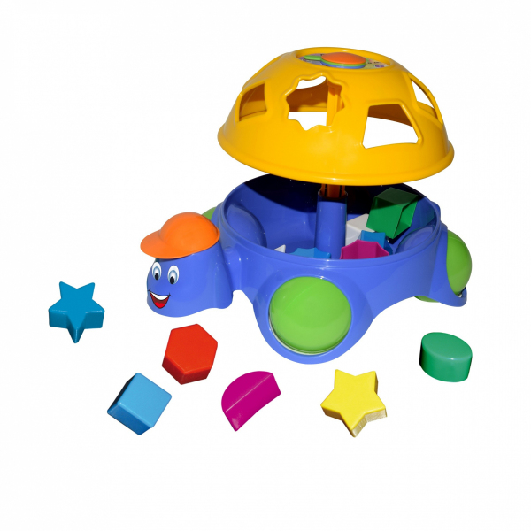 Żółw Leoś wykonany jest z przyjemnego w dotyku plastiku. W zestawie znajdują się specjalne klocki o różnych kształtach, które wkładane mogą być tylko w odpowiednie dla nich otwory. Na górze umieszczony jest zegar.